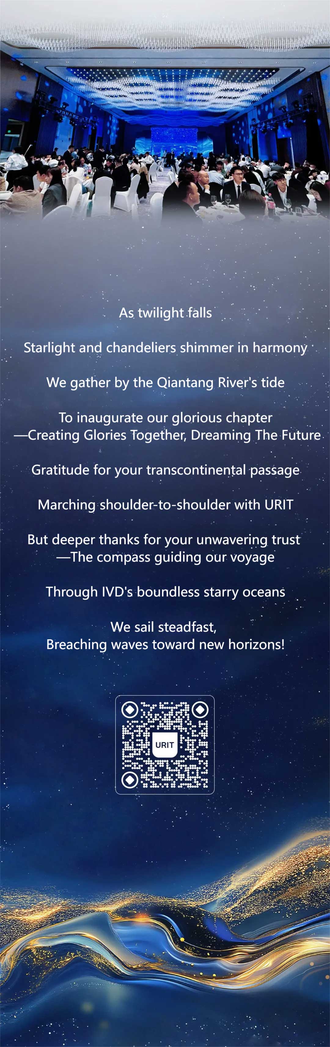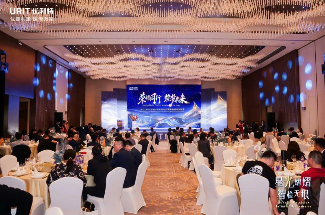 Capture the Moment, Define the Trend. Step before our exquisitely designed backdrop - with just one 'click', your dazzling moment becomes eternal. As you enter the banquet hall, you're transported into the heart of a galaxy. Crystal chandeliers shimmer like constellations overhead, while guests leave their luminous imprints. Thus begins URIT's grand celebration for 300+ global partners at 2025 CACLP - where every snapshot becomes a stellar memorial of this glorious gathering.